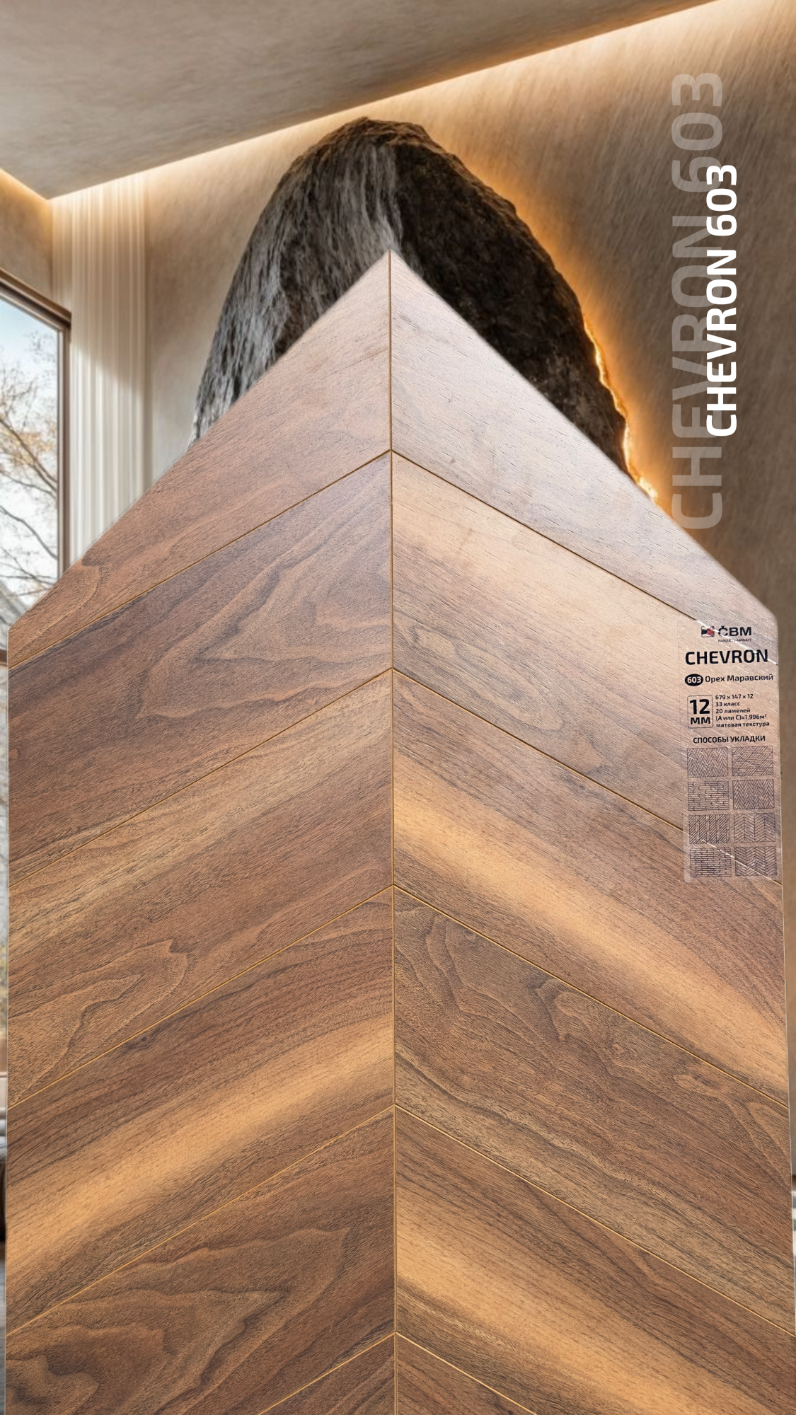 Страна производства Чехия Коллекция Chevron Класс пожарной опасности КМ 3 Производители ламината Cbm Класс ламината 33 Толщина доски ламината 12 мм Размеры доски ламината 679х147 мм Вид\Имитация материала Ёлочка Упаковка ламината 1,996 м2, досок (20 шт одной стороны (А или С), 19 кг. Наличие фаски ламината 4х-сторонняя Влагостойкость ламината Повышенная Срок эксплуатации ламината (в домашних условиях) 25 лет -