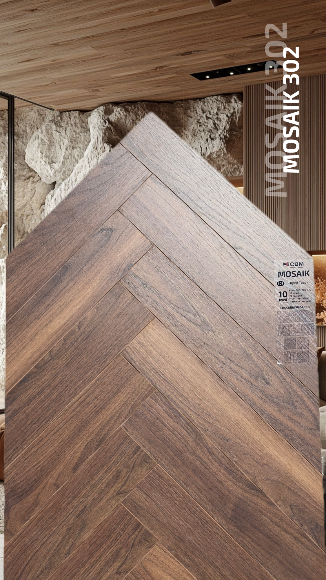 Страна производства Чехия Коллекция Mosaik Класс пожарной опасности КМ 3 Производители ламината Cbm Класс ламината 33 Толщина доски ламината 10 мм Размеры доски ламината 600х100 мм Вид\Имитация материала Ёлочка Упаковка ламината 2,64 м2, досок (22А+22В), 23,4 кг. Наличие фаски ламината 4х-сторонняя Влагостойкость ламината Повышенная Срок эксплуатации ламината (в домашних условиях) 25 лет -