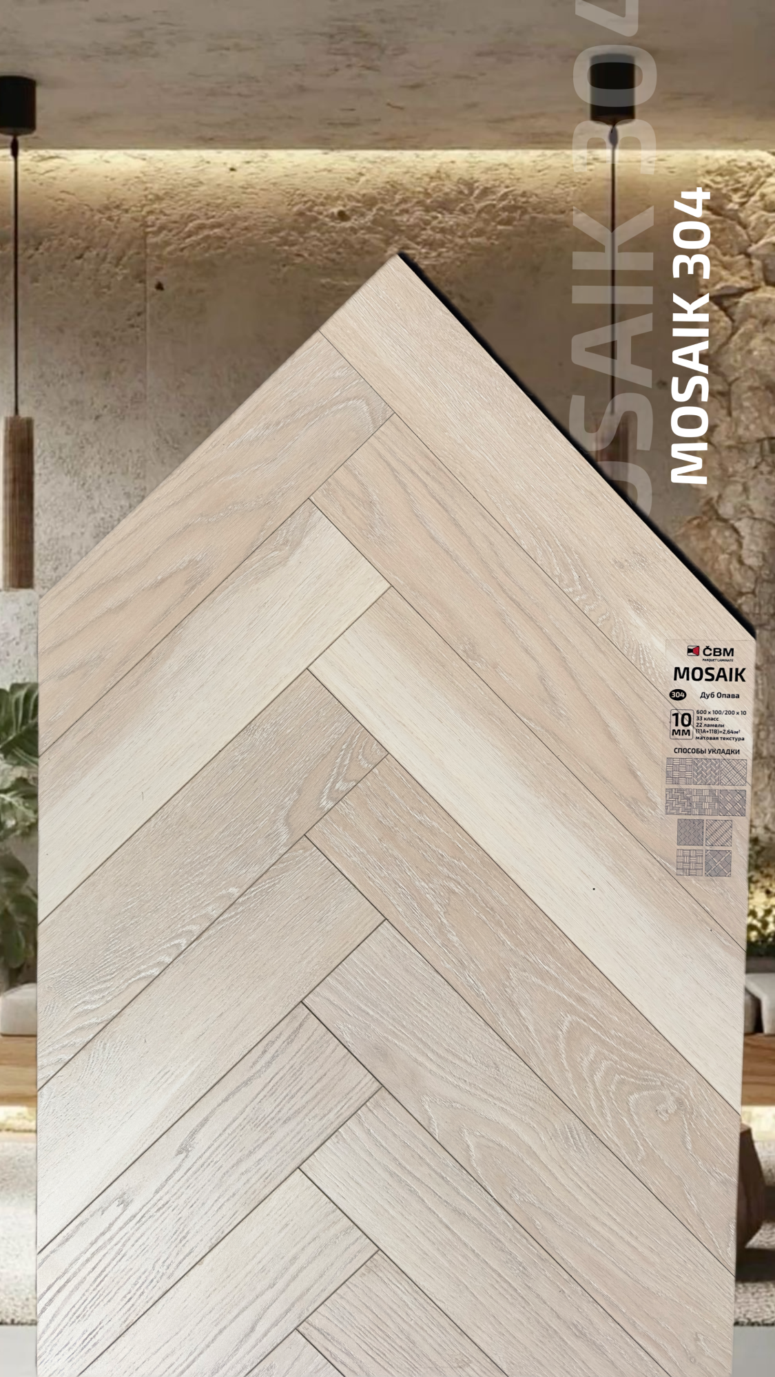 Страна производства Чехия Коллекция Mosaik Класс пожарной опасности КМ 3 Производители ламината Cbm Класс ламината 33 Толщина доски ламината 10 мм Размеры доски ламината 600х100 мм Вид\Имитация материала Ёлочка Упаковка ламината 2,64 м2, досок (22А+22В), 23,4 кг. Наличие фаски ламината 4х-сторонняя Влагостойкость ламината Повышенная Срок эксплуатации ламината (в домашних условиях) 25 лет -